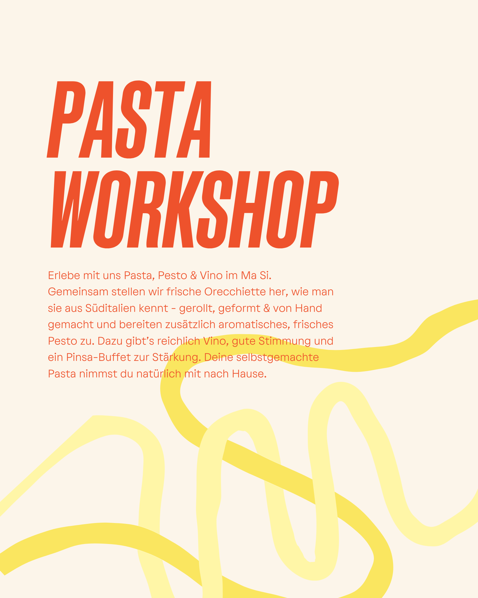 In unserem Ma Si Atelier tauchst du selbst ganz tief in die Italian Experience ein und darfst deiner Kreativität freien Lauf lassen. Hier wartet eine Mischung aus Kreativität und Kulinarik auf dich. Ganze nach dem Motto: "La Dolce Vita".